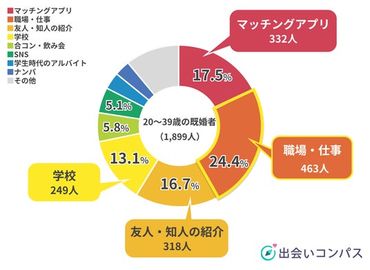 20代から30代までの既婚者1,899人を対象に、結婚相手と知り合った場所についてたずねたところ、最多回答は「職場・仕事」で24.4%(463人)でした。「マッチングアプリ」が17.5%(332人)、「友人・知人の紹介」が16.7%(318人)と続きます。