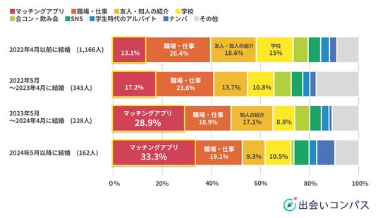 結婚した時期ごとのデータを見てみると、マッチングアプリで出会った相手と結婚している人は2022年4月以前に結婚した人では13.1%(1,166人中153人)に対し、2024年5月以降では33.3%(162人中54人)と、年々増えていることがわかります。