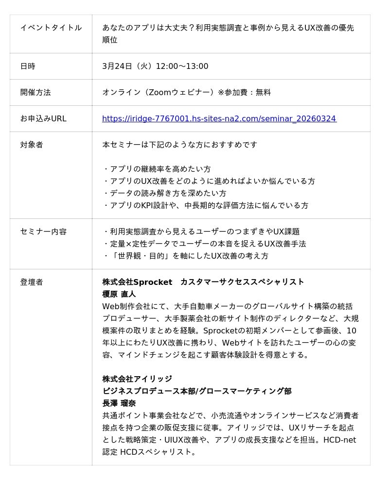 株式会社アイリッジ(本社:東京都港区、代表取締役社長:小田 健太郎、東京証券取引所グロース:3917、以下「アイリッジ」)は、株式会社Sprocket(本社:東京都品川区、代表取締役:深田 浩嗣、以下「Sprocket」)と共同で、2026年3月24日にオンラインセミナー「あなたのアプリは大丈夫?利用実態調査と事例から見えるUX改善の優先順位」を開催することをお知らせします。