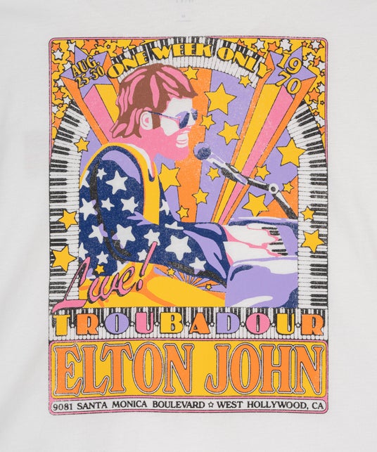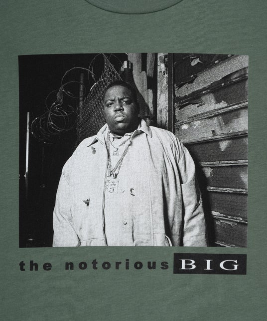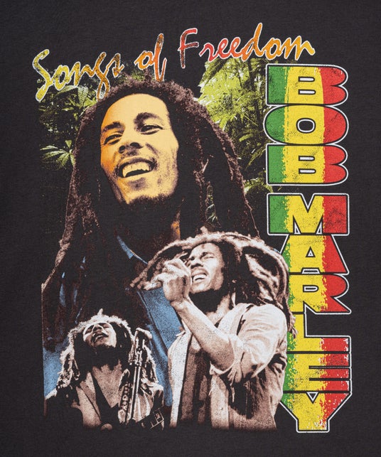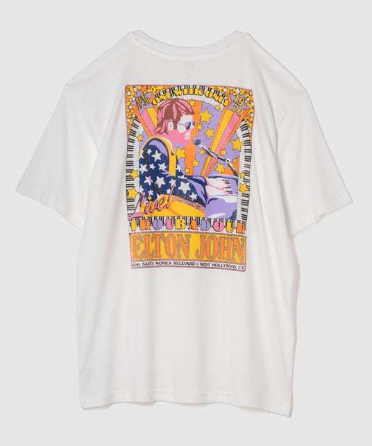 本コラボTシャツのデザインにも注目。ローリング・ストーンズは、アメリカの星条旗柄になったバンドのシンボルマーク “Lips and Tongue”がフロントとバックにデザインされたグラフィックで、世界ツアーを行った1989年の’89も施されています。エルトン・ジョンは、彼自身が初めて米国でライブを行ったロサンゼルスのライヴハウス “Troubadour(トルバドゥール)”や、ピアノを弾くエルトンがカラフルに描かれた遊び心あるポップなデザインが魅力。ボブ・マーリーは、1961年のファーストソング「ジャッジ・ノット」から1980年の最後のライブまでを収録したベストアルバム “Songs of Freedom”の文字、そしてボブの顔がフロントにデザインされています。ガンズ・アンド・ローゼズは、メンバーの骸骨マークを施したダークでロックなグラフィックに。ビースティ・ボーイズは、90年代の “Junior Varsity” ツアーのグラフィックを施し、バックプリントにメンバー3人とゆかりのあるニューヨークの床屋 “JOE & TONY’S BARBARSHOP”や3と大きく描かれたデザインが特徴。ザ・ノトーリアス・B.I.G.は、深いグリーンのボディーにモノクロ写真と彼の名前がプリントされたクールなグラフィックTとなっています。