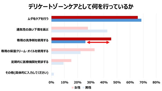 デリケートゾーンケアとして何を行っているか調査したところ、男女どちらも「ムダ毛ケアを行う」と回答した割合が最も高くなる結果となりました。