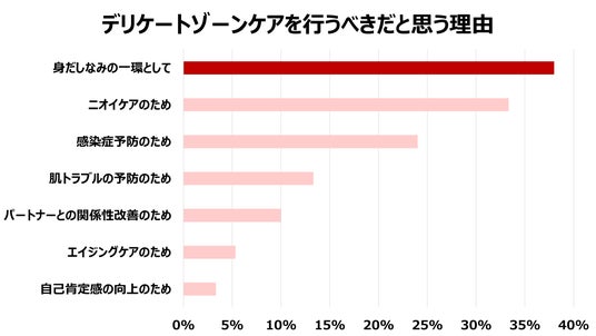 デリケートゾーンケアを行う男性への印象を調査したところ、半数以上の女性が「デリケートゾーンを行うべきだと思う」と回答しました。行うべきだと思うと回答した女性はデリケートゾーンケアを行う男性に関して78%が「とても良い・良い印象」と回答しており、好印象であることがわかります。また、女性が男性に対してデリケートゾーンケアを行うべき理由の第一位は「身だしなみの一環として」で、「ニオイケアのため」、「感染症予防のため」といった回答が続きました。