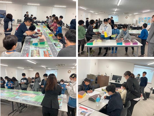 参加した子どもたちは自由にアイディアを出し合いながら、住宅の間取りの作成や美しい街並みを完成させる体験を行いました。方角や窓の位置など周りの環境や建物にも配慮しつつ、設計を楽しんでいました。当社の建築デザイナーが子どもたちへ直接指導を行い、建築デザインの楽しさや魅力を伝える職業体験教室となりました。