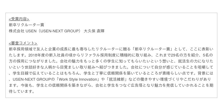 株式会社 USEN-NEXT HOLDINGS(本社:東京都品川区、代表取締役社長CEO:宇野 康秀、以下、当社)は、株式会社MyReferが主催する「Japan Referral Recruiting Award2021」にて、友人と企業の成長に最も寄与したリクルーターが表彰される【リクルーター賞】に当社グループ社員がノミネートされ、【新卒リクルーター賞】を受賞しましたのでお知らせします。