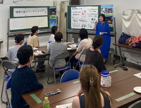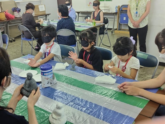 参加者はアイマスクを付け鎌倉大仏の小さな模型を触り、形を確かめながら粘土で大仏を作るワークショップや、カードの凹凸模様が一緒のものをマッチさせるゲーム、透明点字シート付絵本の音読などを体験し、目が見えない人の大切な感覚の一つ「さわる」体験を分かち合いました。