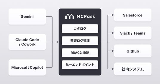「MCPass」は、AIエージェントが業務システムにアクセスする際の認証・権限を一元管理し、すべての操作を監査証跡として自動記録する統制基盤です。単なる接続の仲介にとどまらず、「AIと業務システムをつなぐ」と「つないだ上で統制する」を両立します。