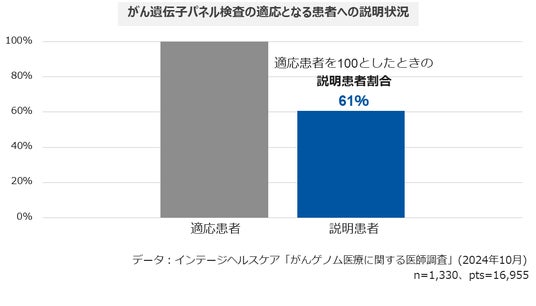- がん遺伝子パネル検査の適応となる患者のうち、医師が説明を実施した患者の割合は61%。適応となる全ての患者に説明がされていない