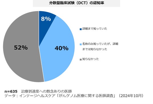 治療到達度の低さに関しては、国内で参加可能な治験の少なさや、都市部と地方間のエリア問題も要因の一つであることが考えられます。そこで、「治療到達度に懸念あり」と回答した医師に患者が定期的に医療機関へ来院不要な治験の手法である「分散型臨床試験(以下、DCT)の認知率」を確認しました。その結果、DCTを「詳細まで知っている」の割合は、8%に留まる結果でした。