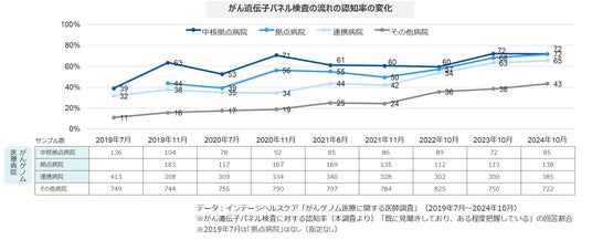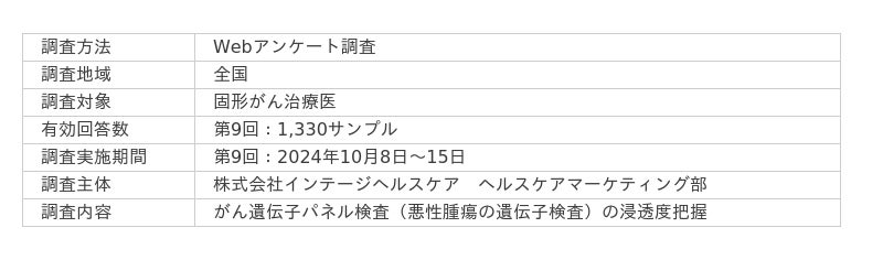 株式会社インテージヘルスケア(本社:東京都千代田区、代表取締役社長:村井啓太)は、全国の固形がん治療医約1,300人を対象に、がん遺伝子パネル検査(※1)に関する実態を調査しました。本調査は2019年6月に第1回を実施し、以降定期的に調査を行い、今回2024年10月が9回目となります。