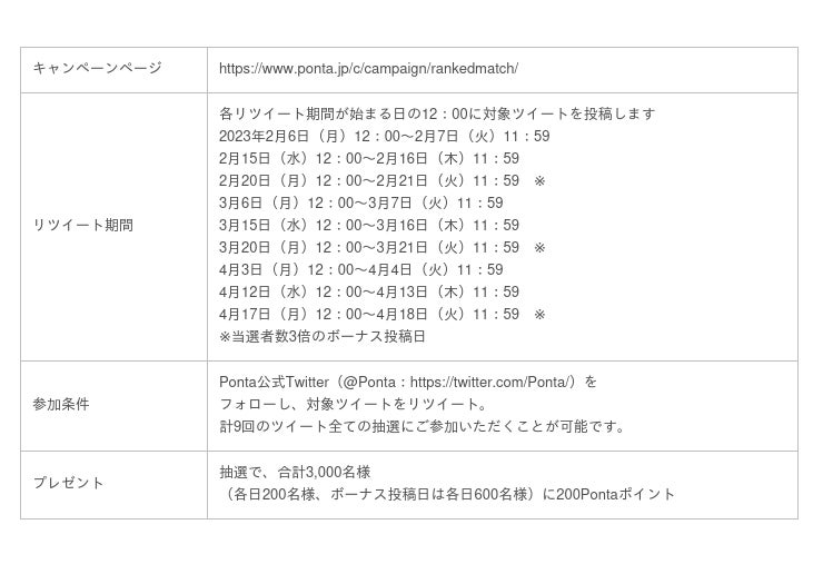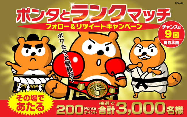 本キャンペーンは、2023年4月30日(日)まで開催中の「ランクアップチャレンジ」(https://www.loyalty.co.jp/news/2023020101)にちなみ、さまざまな“ランク”のポンタと勝負をするというコンセプトで実施します。ボクシングの「ミニマム級」「ミドル級」「ヘビー級」、柔道の「白帯」「茶帯」「黒帯」などのポンタがTwitterに登場します。Ponta公式Twitter(@Ponta:https://twitter.com/Ponta/)をフォローし、キャンペーン期間中に投稿される対象ツイートをリツイートいただいた方の中から、抽選で期間中合計3,000名様に200Pontaポイントをプレゼントします。期間中、毎月1回ボーナス投稿日があり、当選者数が3倍となります。抽選結果は、その場ですぐに表示されます。