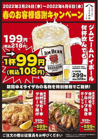 ワタミ株式会社(本社:東京都大田区、以下ワタミ)が展開する「ミライザカ」で「春のお客様感謝キャンペーン」を開催いたします。2022年3月24日(木)~2022年4月6日(水)の期間中、ジムビームハイボールが何杯飲んでも特別価格の1杯99円(税込108円)でお楽しみいただけます。更に、ミライザカが自信を持ってご提供している商品の中でも、ミライザカ名物「清流若鶏モモ一本グローブ揚げ」が通常価格999円(税込1,098円)のところ特別価格599円(税込658円)でご提供致します。度重なる感染症対策により休業が続き、お客様には多大なご不便をおかけしました。本格的に要請解除がされ、全店営業再開に合わせ、特別価格での販売を行います。今回のキャンペーンでは、外食業界をさらに盛り上げていくという強い思いが込められています。ワタミでは『外食だからこそ提供することができる美味しいお料理と、楽しい時間をより多くの方にご体験いただきたい』という想いを込めて、引き続き各自治体のガイドラインを参考に感染症対策を万全に最善の注意を払って営業して参ります。
