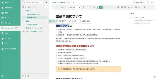 作成した文書はBacklogのプロジェクト配下で管理されるため、タスク管理と文書管理を同じ場所で扱うことができ、情報の散在や引き継ぎの負担を軽減します。
