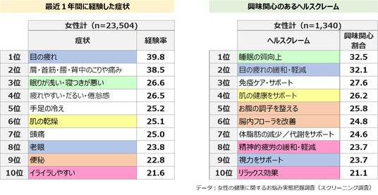 全国20~79歳の女性に最近1年間に経験した症状を確認したところ、「目の疲れ」と「肩・首筋・腰・背中のこりや痛み」が約4割、次いで「睡眠」「疲労」「手足の冷え」などが挙げられています。