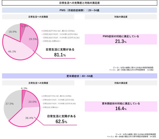PMS・更年期症状ともに日常生活に支障がある人が多いものの、満足のいく対処は出来ていない