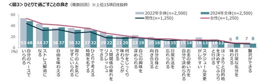 ひとりで過ごすことの良さとして「自分のペースでいられる」が48%とTOP、次いで「ストレス解消になる」「自由を味わえる」「周りの人を気にせずにいられる」「ひとりで考える時間がもてる」が30%台と続く。上位にあげられた良さは女性の割合が多く、特に「ストレス解消になる」「周りの人を気にせずにいられる」は、男性より女性の方が11ポイント高かった。<図3>