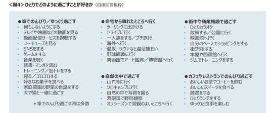ひとりでどのように過ごすことが好きかを確認したところ、多数は「家でのんびり/ゆっくり過ごしたい」をあげ、具体的には何もしないで過ごすやテレビ、映画、動画配信の視聴、ゲーム、SNSを行うとの声があった。外出行動では「自宅から離れたところへ行く」「自然の中で過ごす」「街中や商業施設で過ごす」「カフェやレストランでのんびり過ごす」という意見もあがった。<図4>