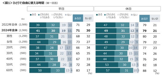 ひとりで自由に使える時間が「ある+どちらかといえばある」人は、平日で71%、休日は79%。年代別には、平日、休日ともに20~40代がやや低い結果である。<図1>