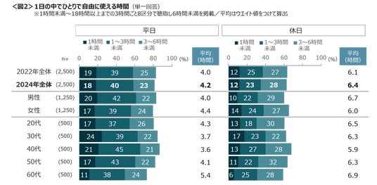 1日の中でひとりで自由に使える時間の平均は、平日で4.2時間、休日は6.4時間と休日の方が2時間ほど多い。平日、休日ともにひとり時間が多いのは60代ではあるが、平日と休日との時間差は最も少ない。<図2>コロナ禍の2年前の調査結果と比べ、ひとりで自由に使える時間の有無や平均時間に大きな変化は見られなかった。