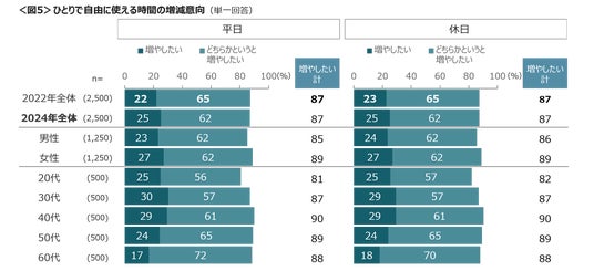 ひとりで自由に使える時間の増減意向は、「増やしたい+どちらかというと増やしたい」は平日も休日も87%と2年前と同様な結果であった。ひとり時間を増やしたい意向が強いのは、家事や育児に時間のとられる女性や40~50代であった。<図5>