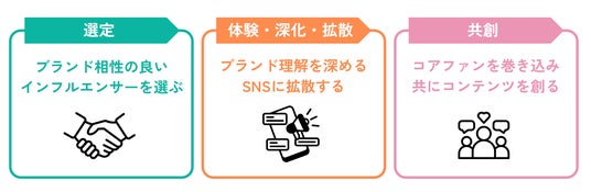 フォロワー数などの定量面だけでなく、ブランドとの相性を重視してインフルエンサーを選定します。その後、ブランド体験を通じて理解を深め、最終的にはインフルエンサーやそのファンを巻き込んだイベント開催などの「共創」へと発展させます。