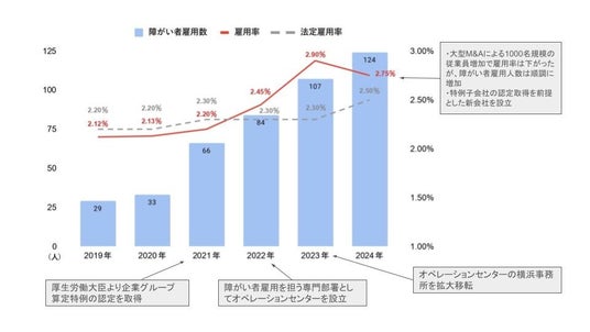 グループ全従業員数大幅増加に対し、本年引き上げ後の法定雇用率を上回る