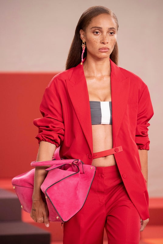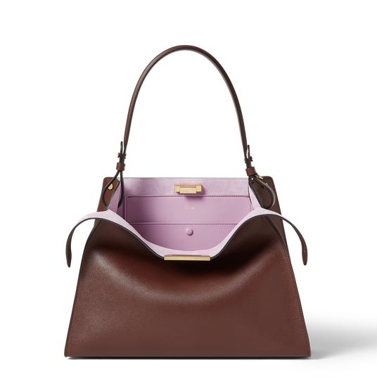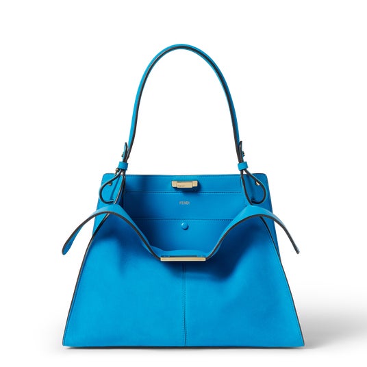 ラージとミディアム、2つのサイズで展開され、驚くべき素材と色の組み合わせで提供されます。時代を超越した色合いが揃うバイカラーのバリエーションは、ライラック×ブラウンからエレクトリックブルー×ダブまで鮮やかなスエードのインナーと組み合わされています。一方、今季のステートメントカラーとして鮮やかなピンクとターコイズブルーのモノカラーバージョンは、スエードにレザーの裏地が付いています。