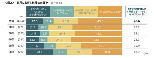 正月におせち料理が「なくても全く気にならない」人は45.8%。「あってほしい」人は3割弱。