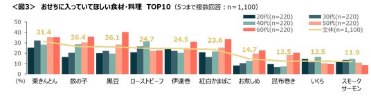 年代別で1位にあがったものは、20代・30代・50代で「栗きんとん」、40代で「ローストビーフ」、60代で「黒豆」。「黒豆」「数の子」「紅白かまぼこ」「お煮しめ」は年代があがるほど高い傾向。<図3>