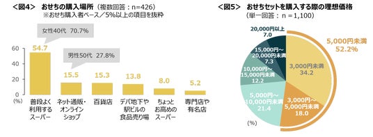 女性40代で「普段よく利用するスーパー」が7割、男性50代で「ネット通販」が3割弱と高い。<図4> おせちセットを購入する際の理想価格は、「3,000円未満」が34.2%が最も多く、5,000円未満で5割を超える。<図5>