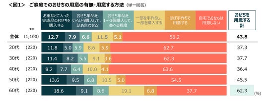 自宅でおせちを用意する人は、43.8%と半数を下回る。「お重などに入った完成品のおせちを購入する」「一部を手作りし、一部を購入する」が1割台。