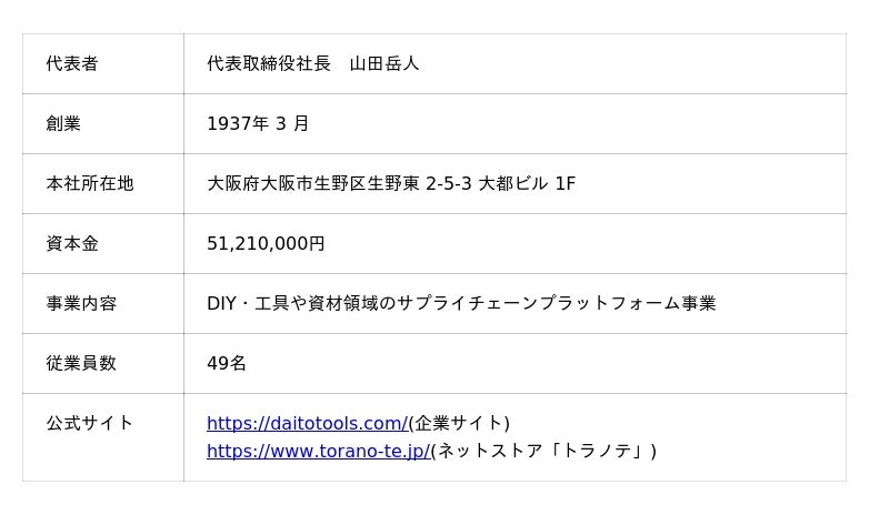 株式会社大都は、1937年創業の工具問屋をルーツに持ち、2002年にEC事業へ転換。DIY用品のECサイト「DIY FACTORY」を運営し、DIY文化の普及に貢献してきました。現在は、建築・建設・製造業の現場を支える事業者向けBtoB-ECサイト「トラノテ」を展開。400万点以上の工具・資材を迅速に提供し、業界のサプライチェーン変革を目指す、大阪発の企業です。
