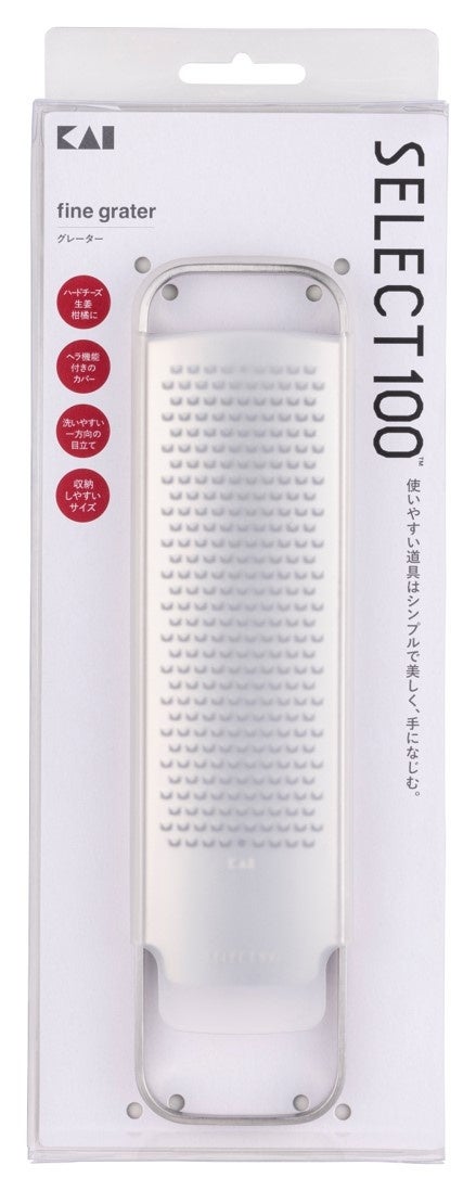 従来のグレーターの持つ商品性と印象に根本から向き合い、より身近で扱いやすい“道具”として完成度の高いデザインがなされている。独自のサイズと目立てによって、グレーターとしての使用感は向上し、またおろし金を使っていた食材であってもストレスなくおろすことを可能にしている。一方向の目立ては、使用感を損なうことなくメンテナンス性が大きく向上しており、同社の刃物に関する知見の深さを窺い知ることができる。ケースにも機能を付与することで無駄のないデザインがなされている。そのケースをつけたまま食材をおろすことで、一時的に食材を受け止められる副次的機能も評価したい。