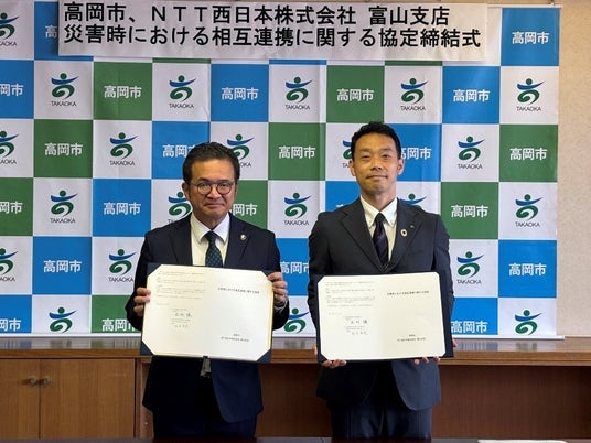NTT西日本株式会社富山支店(支店長:瓜生 知史、以下「NTT西日本」)は、高岡市(市長:出町 譲)と地域の防災力強化および災害時の迅速な通信復旧体制の構築を目的として、「災害時における相互連携に関する協定(以下、本協定)」を、2026年4月20日(月)に締結いたしました。