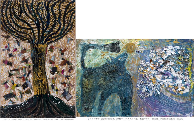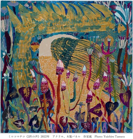ミロコマチコは、東京都美術館の個性的な広い空間に合わせて、生命のうごめく奄美大島をイメージしたインスタレーションを制作。