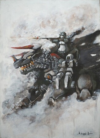 「どこまでも白く凍った大地、吹雪の中彼女たちは進んでいく。相棒のカイジュウは歴戦の傷と寒さにやられた身体を機械化して生きている。遠くに獲物の影が見えた。すかさず少女は銃を構え撃つ。命中だ。いつかこの凍てつく大地を抜け出る日のために、ふたりは雪原をいく…。(渡辺)」B3サイズ、額装なし、サイン有。