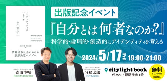 クロスメディアグループ株式会社(本社:東京都渋谷区、代表:小早川幸一郎)は、2024年5月17日(金)に『アイデンティティのつくり方』出版記念イベント「自分とは何者なのか?」を開催いたします。書籍『アイデンティティのつくり方』の共著者・森山博暢氏、各務太郎氏が書籍の内容をもとに、自分の力でアイデンティティをデザインする方法について、それぞれのリアルなエピソードを交えて解説します。