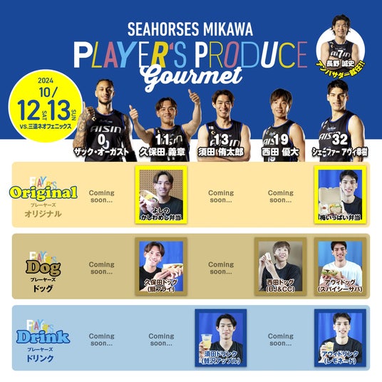 今シーズンは、#0 ザック・オーガスト選手、#11 久保田義章選手、#13 須田侑太郎選手、#19 西田優大選手、#32 シェーファーアヴィ幸樹選手の5選手が「選手プロデュースグルメ」を開発!