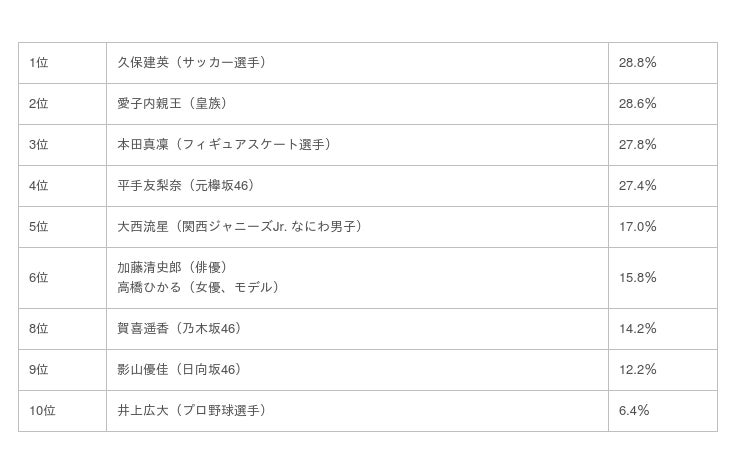 最後に、今年の新成人(有名人)のうち活躍を期待・応援している人を尋ねました。1位はサッカー選手の「久保建英さん」、2位は皇族の「愛子内親王」、3位はフィギュアスケート選手の「本田真凜さん」、4位から10位は以下の通りです。
