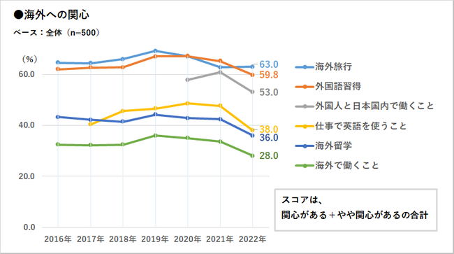新型コロナ感染拡大を境に、海外への関心が軒並み低迷。「仕事で英語を使うこと」はピークから10.6ポイントも低下