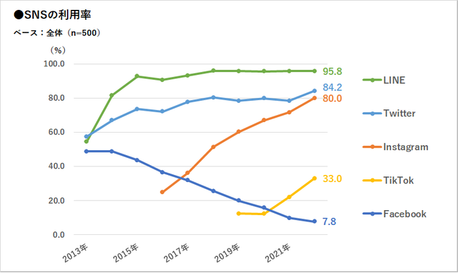 SNS利用率、「Instagram」「TikTok」が躍進。「TikTok」は2年で2.7倍に