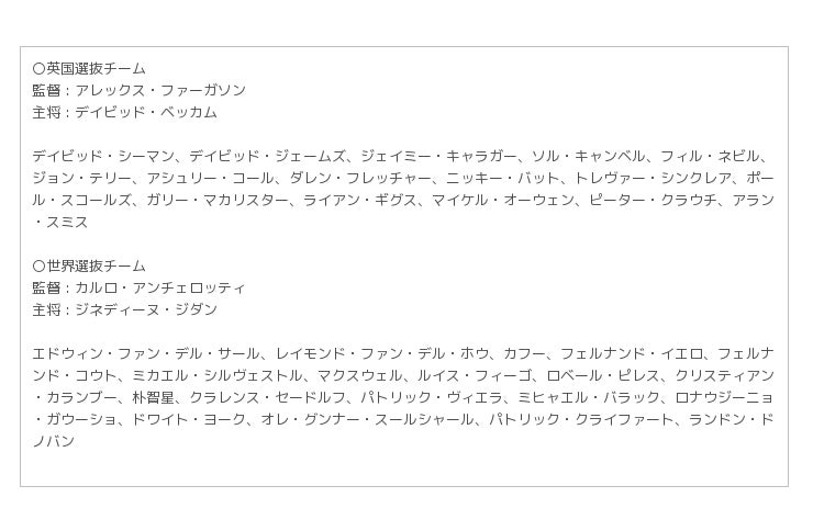 困難な状況にある世界の子どもたちへの支援を呼びかけるための、1回限りのこの試合に、サッカー界のスターたちが集結します。英国選抜チームの主将はユニセフ親善大使のデイビッド・ベッカム、監督は同じくユニセフ親善大使のアレックス・ファーガソンが務め、対する世界選抜チームはジネディーヌ・ジダン主将とカルロ・アンチェロッティ監督が率います。