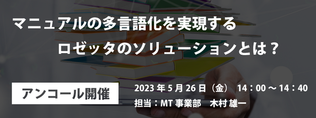 高精度AI自動翻訳の開発・運営を行う株式会社ロゼッタ(本社:東京都千代田区 代表取締役:渡邊 麻呂)は、無料ウェビナー『マニュアルの多言語化を実現するロゼッタのソリューションとは?(アンコール開催)』を2023年5月26日(金)に開催いたします。