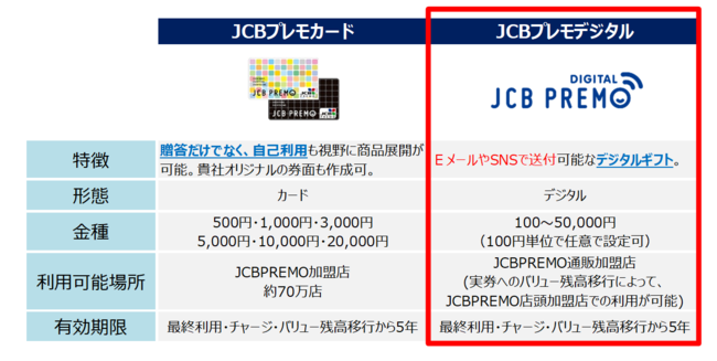 JCBプレモデジタルは、メールやSNSで簡単に贈ることができるデジタルギフトで、JCB PREMO加盟店のオンラインショッピング・ウェブサイトでご利用いただけます。また、JCBプレモカードへのバリュー移行により、コンビニエンスストアや百貨店など全国70万店以上のJCB PREMO加盟店でもご利用いただけます。