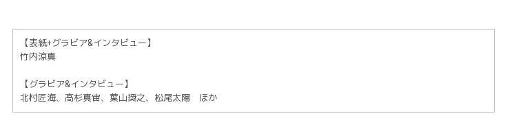 次世代を担う25歳以下の俳優を特集する今号では、表紙・巻頭インタビューに、NHK連続テレビ小説『ひよっこ』に出演し、現在放送中のドラマ『過保護のカホコ』で多くの女性視聴者を魅了している竹内涼真が登場。そのほか、グラビア&インタビューには、北村匠海、高杉真宙、葉山奨之、松尾太陽ら出演作が続く今後も注目の25歳以下の俳優陣が登場。今、彼らは何を思い、何を語るのか…。撮り下ろし写真で、テキストで、彼らの今をたっぷりお届けします!