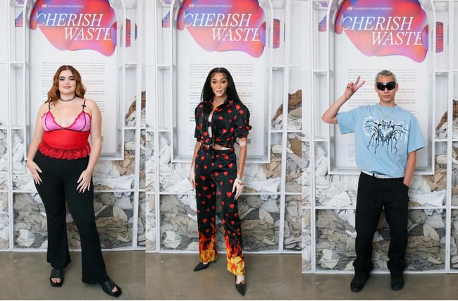 モデルのバービー・フェレイラ(Barbie Ferreira)、ウィニー・ハーロウ(Winnie Harlow)、エヴァン・モック(Evan Mock)の3人はそれぞれ、100%リサイクルポリエステル製のサテンxレーストップス(¥7,999)、Naia™RENEWを使用したプリントセットアップ(各¥9,999)、Texloop™ RCOT™リサイクルコットンを使用したオーバーサイズデザインTシャツ(¥3,999)を着用し、ニューヨークで開催された「H&M Innovation Cherish Waste展」に出席しました。
