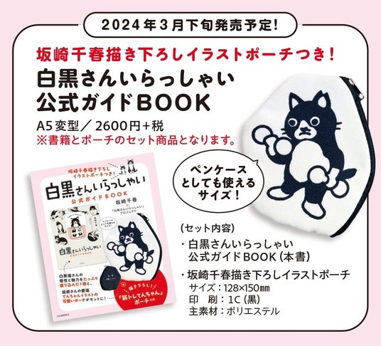 本書『白黒さんいらっしゃい公式ガイドBOOK』と、坂崎千春さんの愛猫「てんちゃん」が筋トレをするかわいい「描き下ろしイラストポーチ」がセットになった『坂崎千春描き下ろしイラストポーチつき! 白黒さんいらっしゃい公式ガイドBOOK』が、3月26日に全国書店で発売予定。