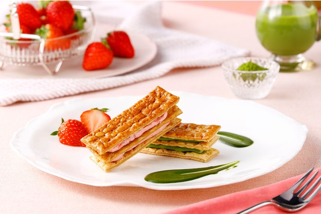 フランス産の小麦パイ生地を使用した、“サクッ”とした食感が特徴のこだわりのフィユタージュに、宇治抹茶を練り込んだ香り豊かなクリームと甘酸っぱいいちごを使用したクリームをそれぞれサンドいたしました。