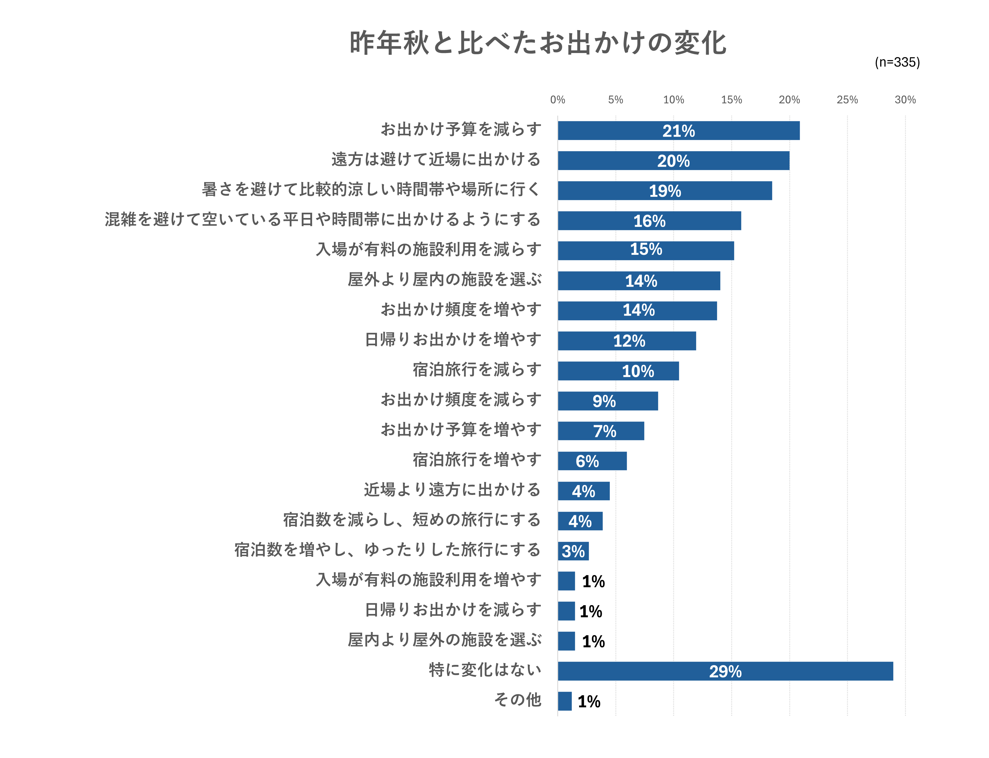次いで「遠方は避けて近場に出かける(20%)」が続きました。移動費や宿泊費などの負担、長時間移動の負担を抑えてお出かけするという動きも目立ちました。
