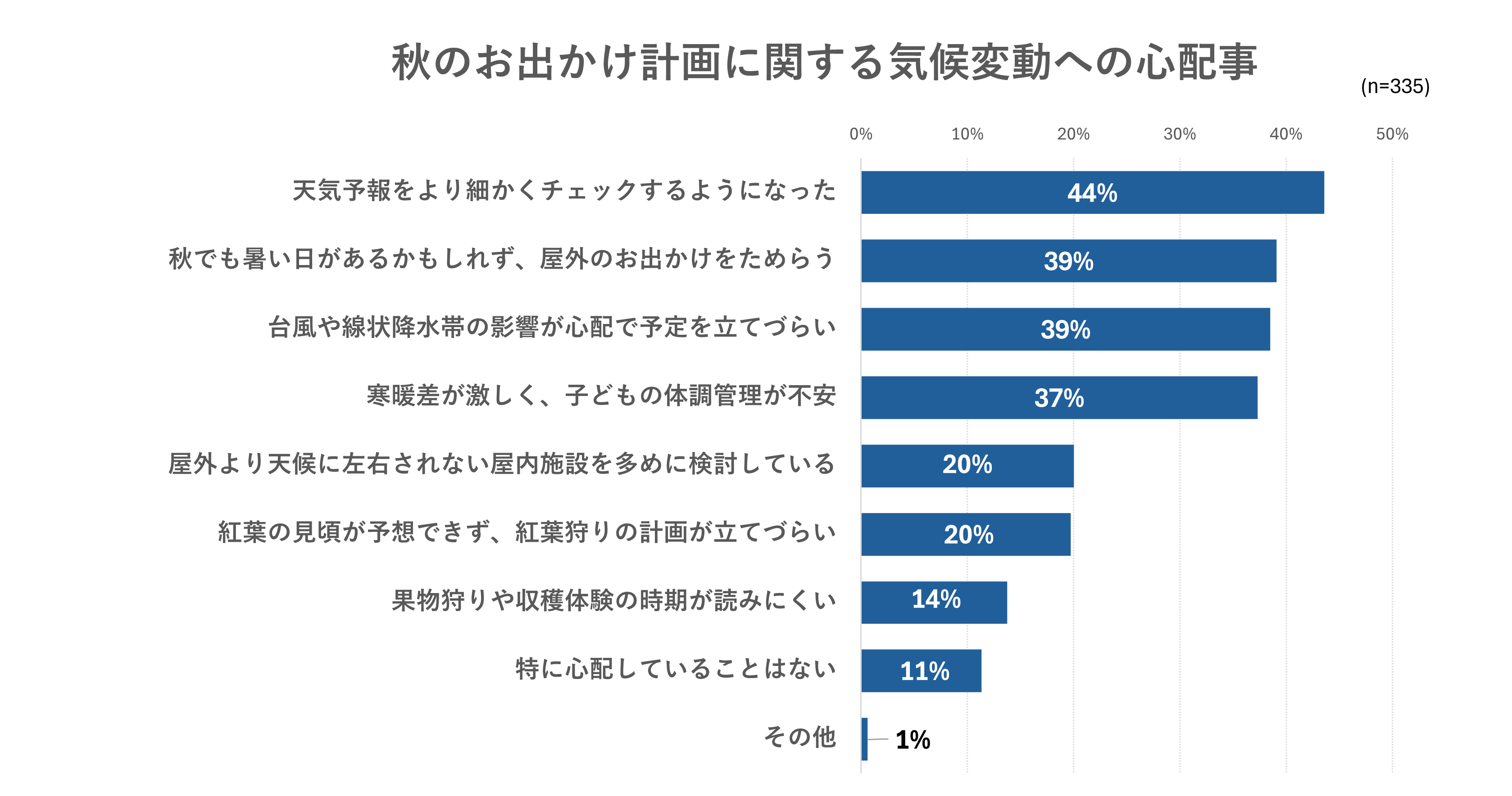 気候変動への対応としては、天気をこまめにチェックしながら柔軟に予定を組む家庭が増えているほか、予算を抑えつつ、近場や時間帯を工夫して楽しむスタイルも広がっています。自由回答では、ハロウィンイベントや紅葉狩り、果物狩り、文化施設の利用など、秋らしい体験を計画する声が多く寄せられました。