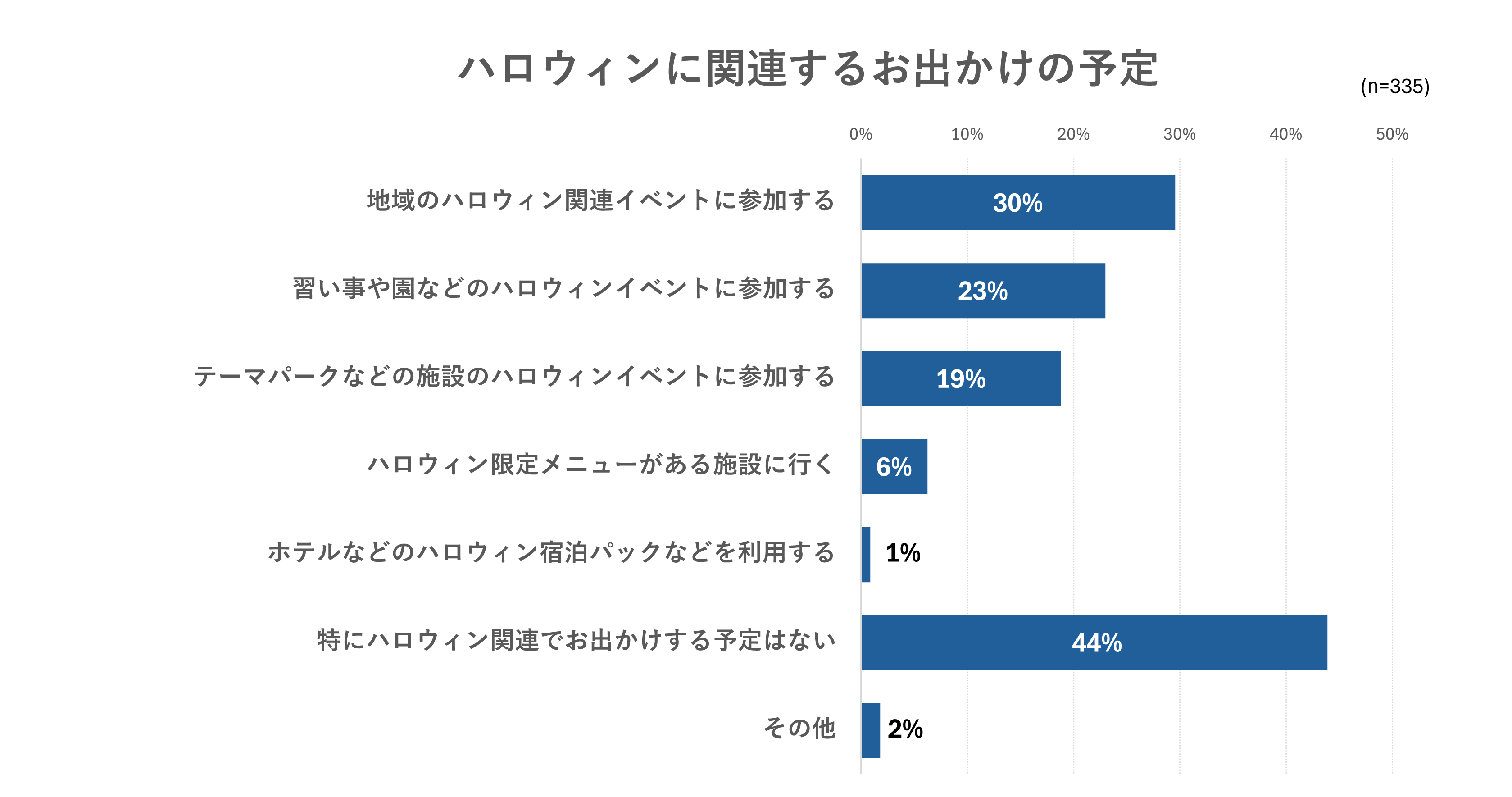 実際に、ハロウィンのお出かけ予定で多かったのは「地域のハロウィン関連イベントに参加する」(30%)で、次いで「習い事や園などのハロウィンイベントに参加する」(23%)でした。商店街や自治体、園や習い事など、生活圏のなかでハロウィンを楽しもうとする姿が目立ちます。